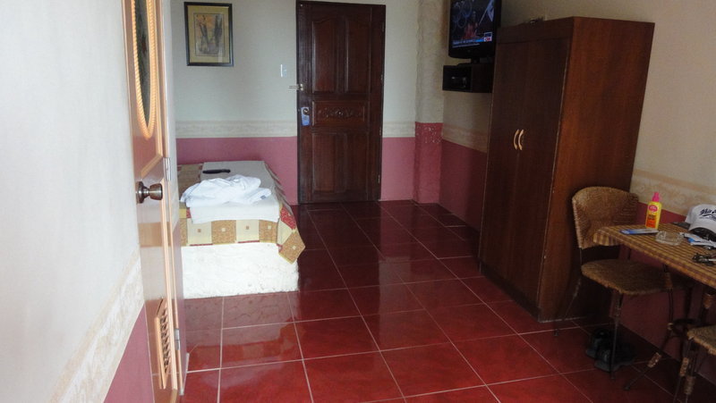 The main room. The bathroom door is visible. The bed is built on a stone frame - no squeaking or moving across the room!